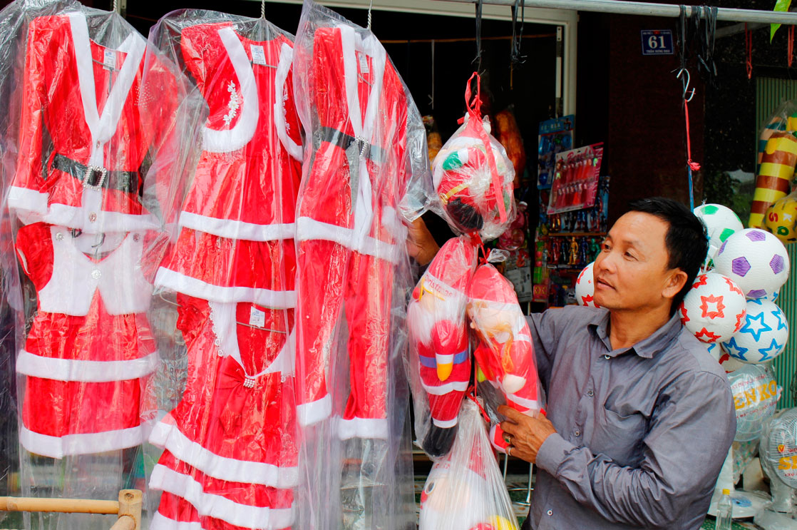 Năm nay, các quầy hàng trên địa bàn huyện bày bán nhiều mặt hàng trang trí với cây thông, trái châu, người tuyết, dây kim tuyến,... đáp ứng nhu cầu mua sắm của khách hàng. Ông Nguyễn Văn Quang - chủ Nhà sách Cần Đước 2, cho biết: “Giá các mặt hàng phục vụ Noel tương đối ổn định so với những năm trước, dao động từ 10.000-20.000 đồng. Cây thông trang trí sẵn có giá từ 300.000 đồng đến vài triệu đồng/cây; quần áo ông già Noel từ 100.000-300.000 đồng/bộ, tùy theo kích cỡ và chất liệu vải. Những mặt hàng được dùng làm quà tặng như thú nhồi bông hình dáng ông già Noel, người tuyết làm bằng xốp, hang đá làm thủ công, vòng nguyệt quế,... đều có giá tương đối với nhiều mẫu mã”.