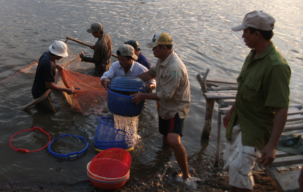 Năm 2015, Cần Giuộc thả nuôi tôm với tổng diện tích 2.500ha (Trong ảnh: Người dân đang thu