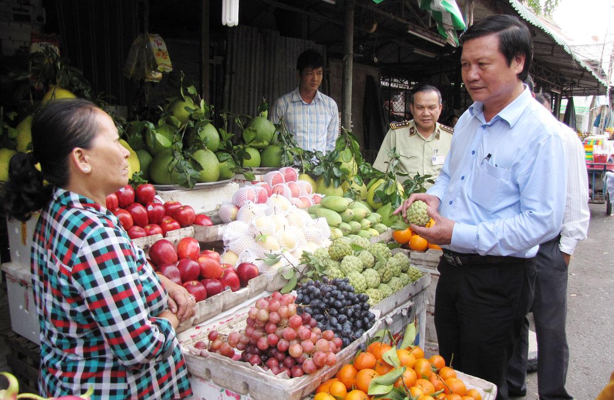 Giám đốc Sở Công Thương - Lê Minh Đức thăm hỏi về kế hoạch mua bán phục vụ tết của tiểu thương tại chợ Cần Giuộc