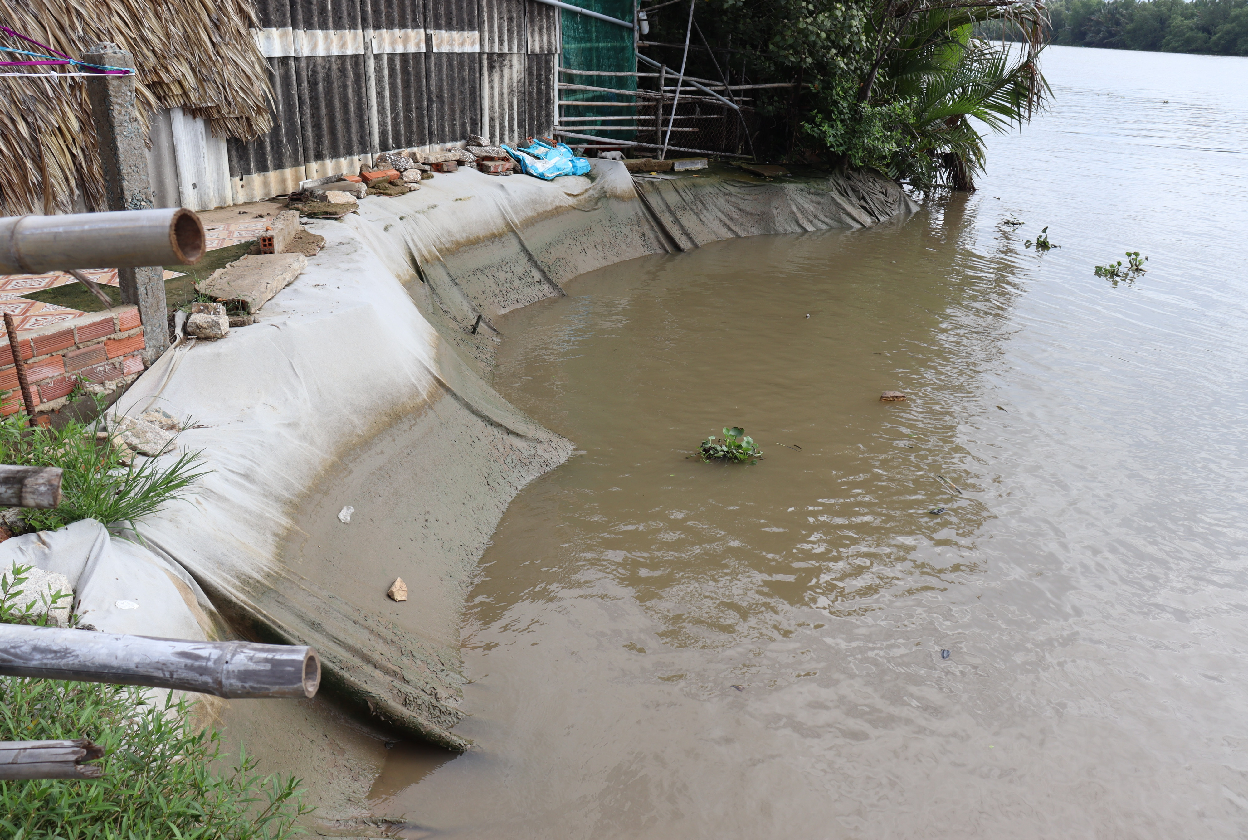 Để hạn chế sạt lở, người dân dùng bạt che chắn