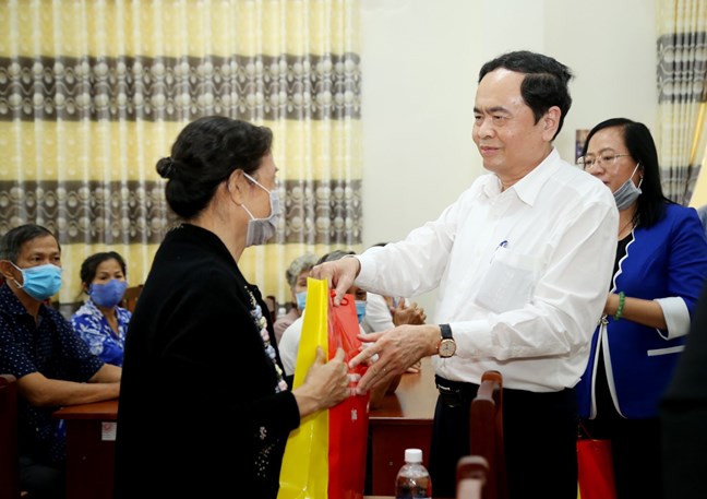 | Chủ tịch Ủy ban Trung ương MTTQ Việt Nam Trần Thanh Mẫn trao quà cho bà con phường Tân An, thành phố Cần Thơ . |