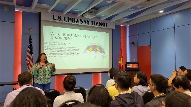 Bà Michelle Peters: Tôi có 3 ngày ở Việt Nam thôi, và từ những câu hỏi mà tôi trao đổi với mọi người thì tôi có một câu hỏi lớn nhất là: Cộng đồng Việt Nam hiện nay đang triển khai và đạt kết quả như thế nào để có thể giáo dục hoặc nâng cao nhận thức của những người khác về chứng tự kỷ? Qua những thông tin ban đầu của mọi người, thì tôi cảm nhận được là không có nhiều thông tin lắm, hoặc là có những thông tin không được chia sẻ giữa các nhóm khác nhau, hoặc là những phụ huynh ở thành thị có nhiều thông tin hơn phụ huynh ở nông thôn...