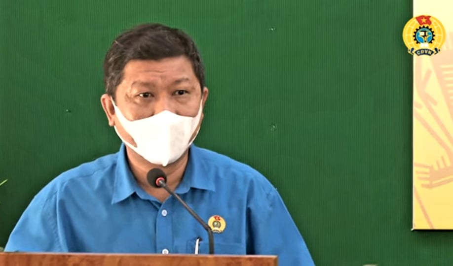 | Phó Chủ tịch Thường trực Liên đoàn Lao động TP Trần Đoàn Trung phát biểu tại Hội nghị trực tuyến |