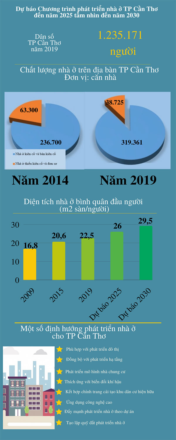 Từ những khó khăn, vướng mắc khi triển khai Chương trình phát triển nhà ở TP Cần Thơ đến năm 2020, tầm nhìn đến năm 2030, Sở Xây dựng đã chủ trì xây dựng Chương trình phát triển nhà ở TP Cần Thơ đến năm 2025 và định hướng đến năm 2030. Sở Xây dựng cũng vừa tổ chức lấy ý kiến góp ý các sở, ban, ngành cho Dự thảo điều chỉnh Chương trình phát triển nhà ở TP Cần Thơ đến năm 2025 và định hướng đến năm 2030. Theo nội dung dự thảo, đơn vị tư vấn ước tính nhu cầu phát triển nhà ở chung cư của thành phố giai đoạn 2020-2025 khoảng 7,6 triệu mét vuông sàn; giai đoạn 2026-2030 khoảng 8,5 triệu mét vuông sàn và dự báo dân số cơ học tập trung nén vào các đô thị Cái Răng, Ninh Kiều, Thốt Nốt, Bình Thủy, giảm dần khoảng cách giữa các quận, huyện…