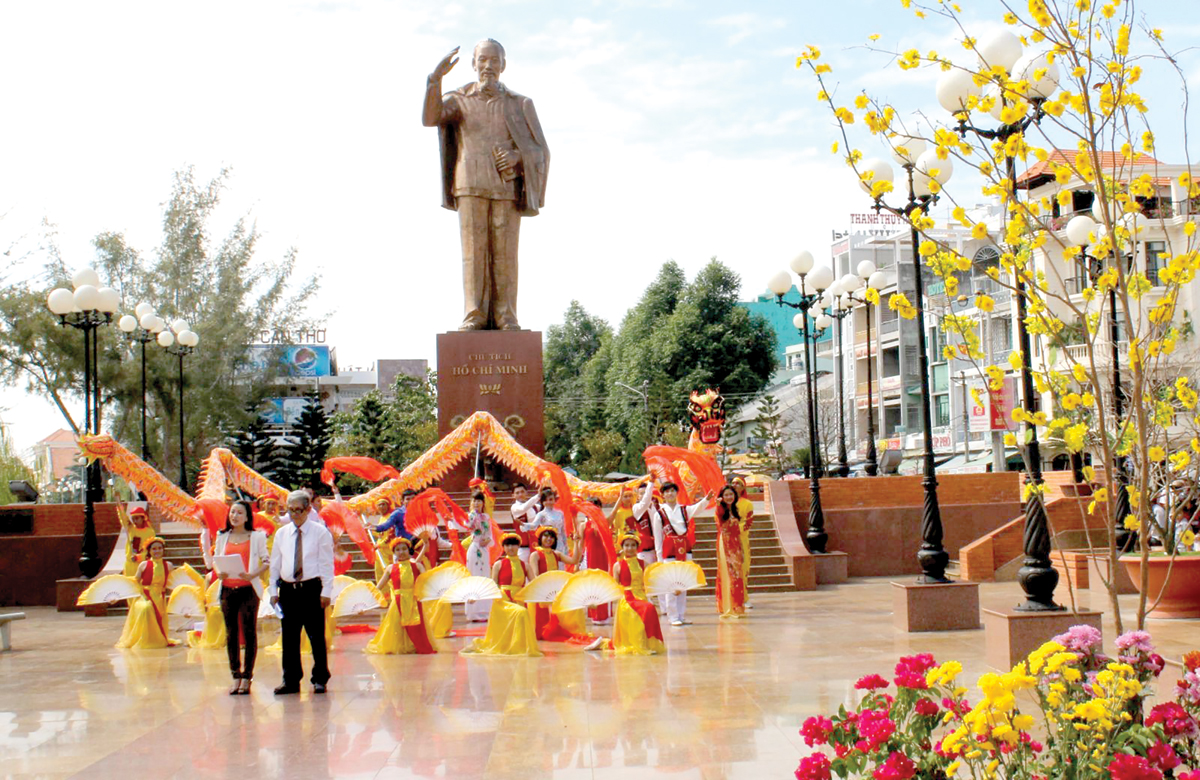 Biểu diễn văn nghệ trước Tượng đài Bác Hồ ở bến Ninh Kiều. Ảnh: DUY KHÔI