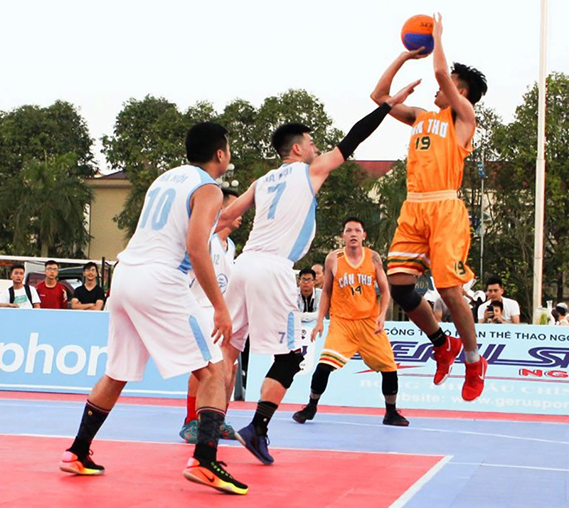 Đội tuyển Bóng rổ nam Cần Thơ (ảnh, phải) thi đấu tại Giải vô địch bóng rổ 3x3 quốc gia năm 2018.