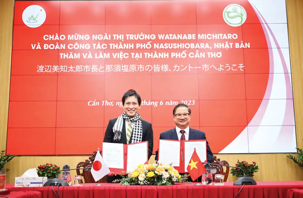 Đồng chí Trần Việt Trường, Chủ tịch UBND TP Cần Thơ (bìa phải) và ông Watanabe Michitaro, Thị trưởng thành phố Nasushiobara (Nhật Bản) trao Bản ghi nhớ hợp tác của hai địa phương.