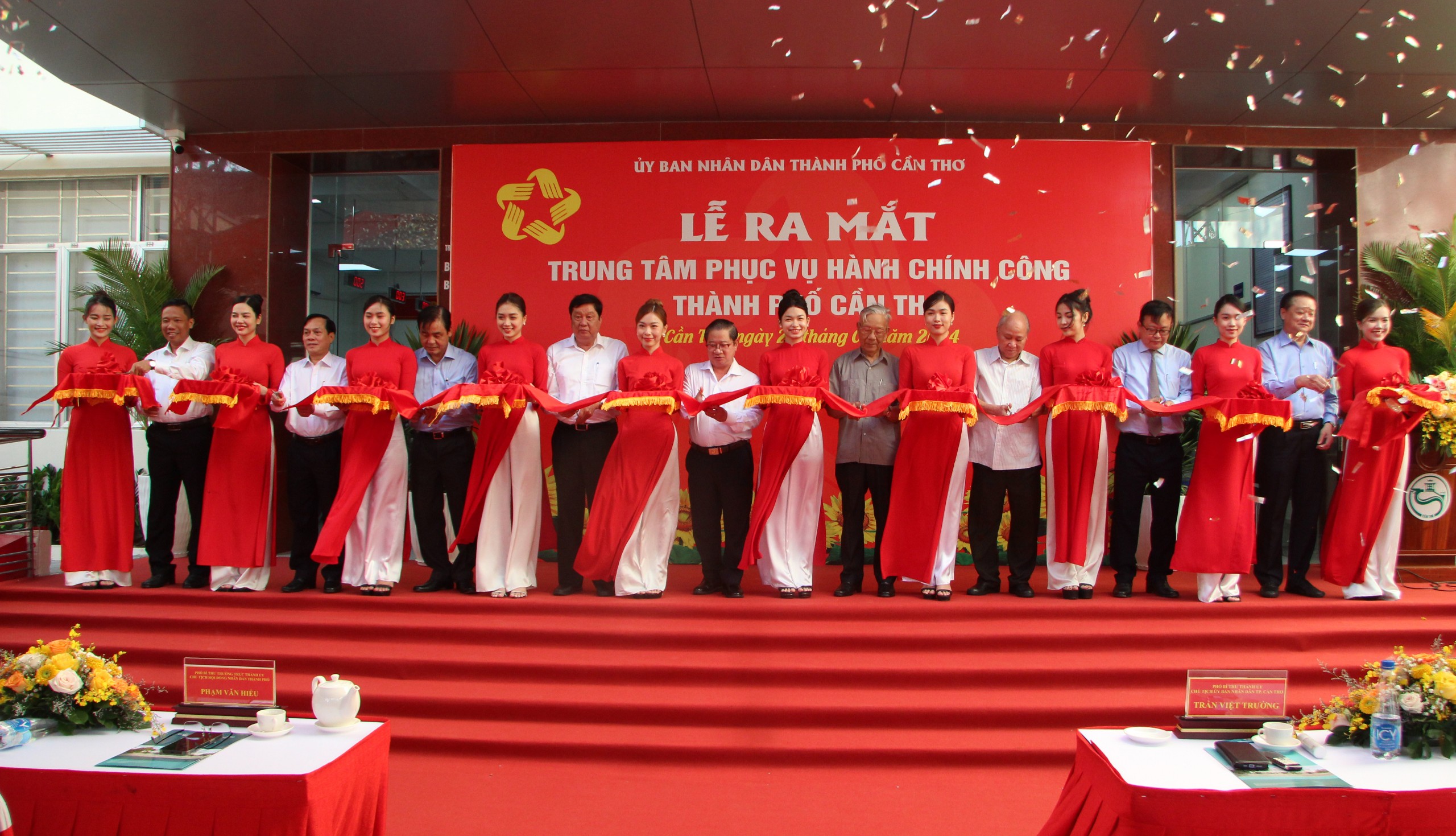 | Các đại biểu thực hiện nghi thức cắt băng đánh dấu sự kiện Trung tâm Phục vụ hành chính công thành phố Cần Thơ chính thức đi vào hoạt động. |
