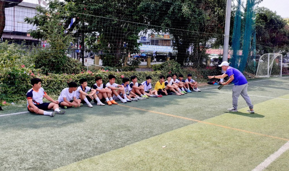 HLV Lý Tiền Minh trao đổi với các học trò trong buổi đá tập huấn với đội U15 Cần Thơ.