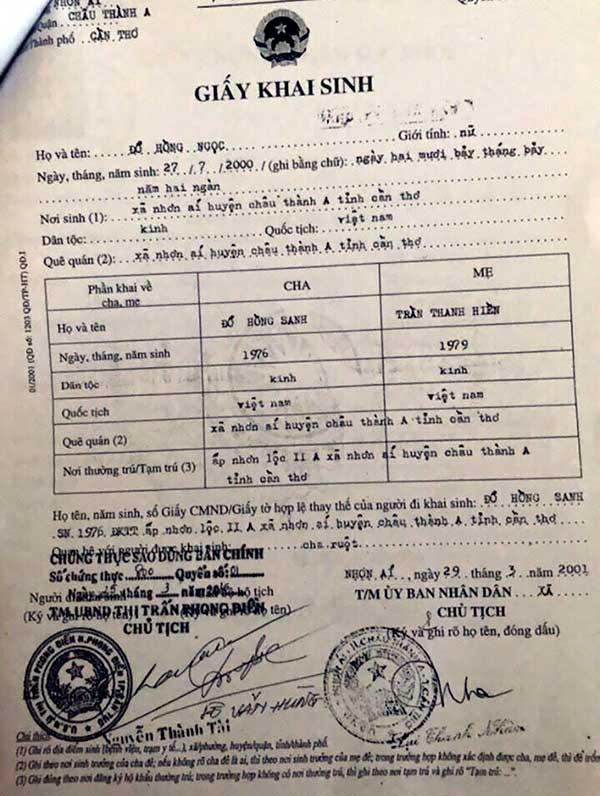 Giấy khai sinh của võ sĩ Đỗ Hồng Ngọc do gia đình cung cấp, để chứng minh giới tính của VĐV này là nữ.