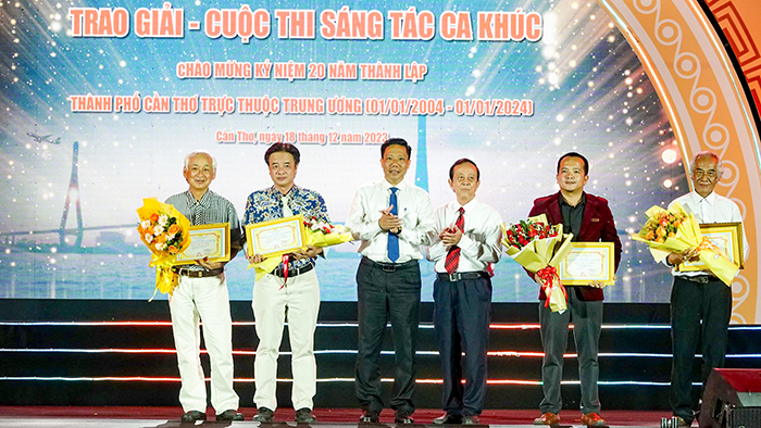 Nhạc sĩ Mai Trung Nghĩa (bìa phải) nhận giải Nhất cuộc thi sáng tác ca khúc chào mừng 20 năm thành lập TP Cần Thơ trực thuộc Trung ương.