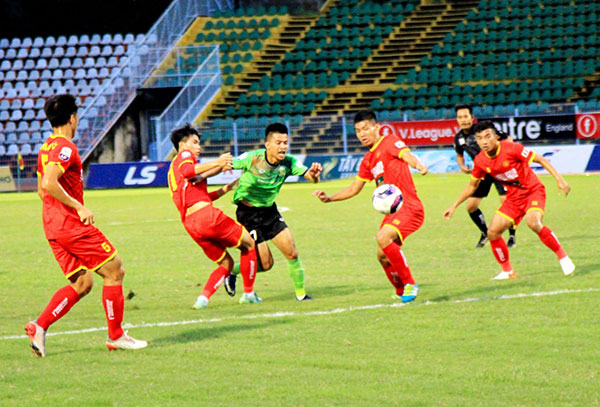 Pha xâm nhập vòng cấm của tiền đạo Vũ Linh (giữa) của Cần Thơ trong trận đấu với Công an nhân dân.