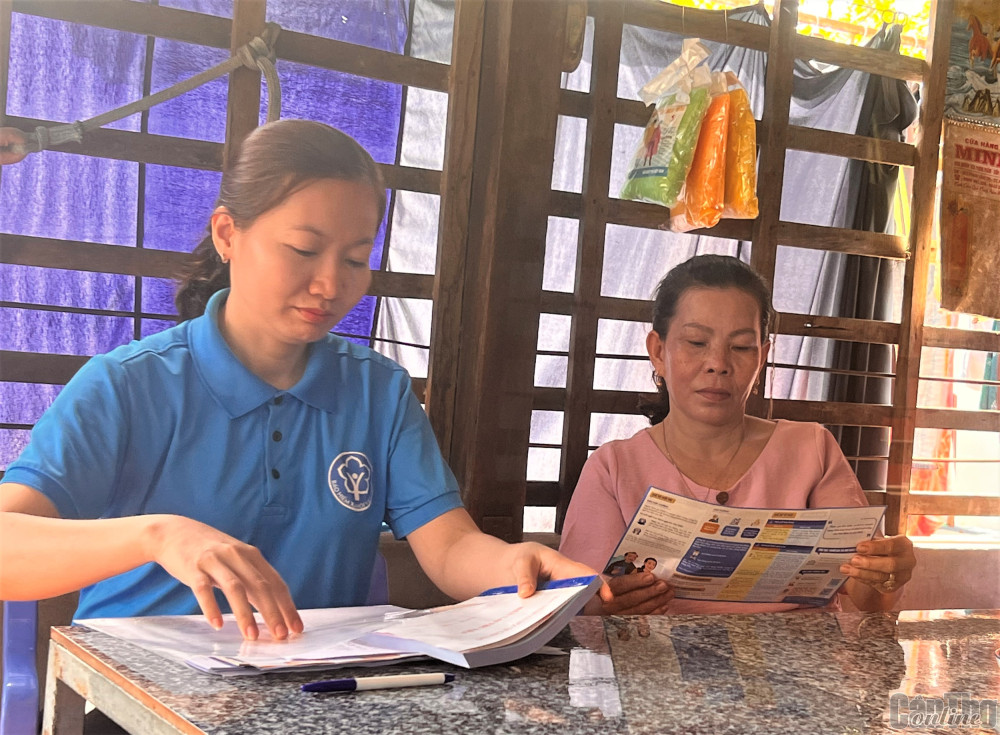 Đại lý thu BHYT ở xã Tân Thới, huyện Phong Điền (bên trái) tuyên truyền, vận động người dân tham gia.