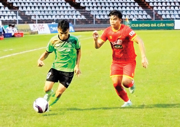 Tiền vệ Hoàng Thanh Tùng (trái) của Cần Thơ đi bóng qua hậu vệ của Công an nhân dân trong trận đấu trên sân Cần Thơ.