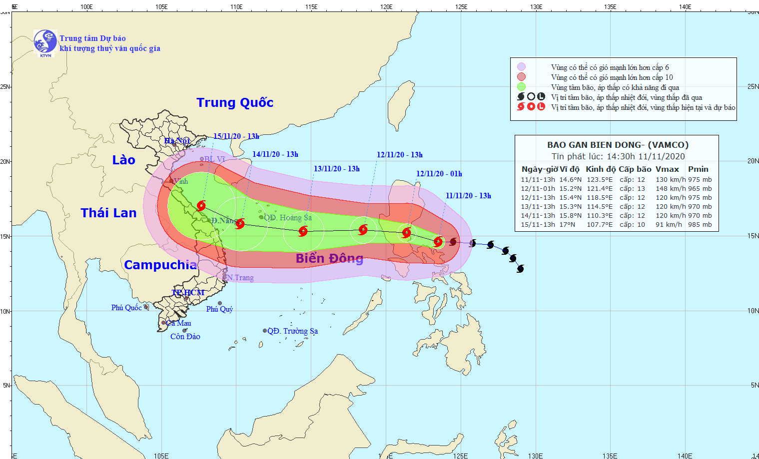 Theo bản tin của Trung tâm dự báo khí tượng thủy văn Quốc gia, hồi 13h ngày 11/11, bão VAMCO ở khoảng 14,6 độ Vĩ Bắc; 123,5 độ Kinh Đông, cách phía Nam đảo Lu- dông (Philippines) khoảng 200km về phía Đông Đông Nam, gió cấp 12, giật cấp 15.