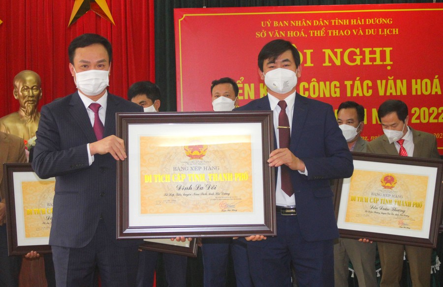 Nhân dịp này, đồng chí Phó Bí thư Tỉnh ủy, Chủ tịch UBND tỉnh Triệu Thế Hùng đã trao bằng xếp hạng cho 11 di tích cấp tỉnh. Trung tâm Văn hóa, Thông tin và Thể thao TP Hải Dương được nhận cờ đơn vị dẫn đầu phong trào thi đua của Bộ Văn hóa, Thể thao và Du lịch. Bộ Văn hóa, Thể thao và Du lịch tặng bằng khen cho 7 tập thể và 3 cá nhân. UBND tỉnh tặng bằng khen cho 2 tập thể và 11 cá nhân.../.