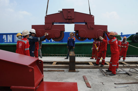 Công nhân đang lắp đặt các thiết bị trong hệ thống cần cẩu