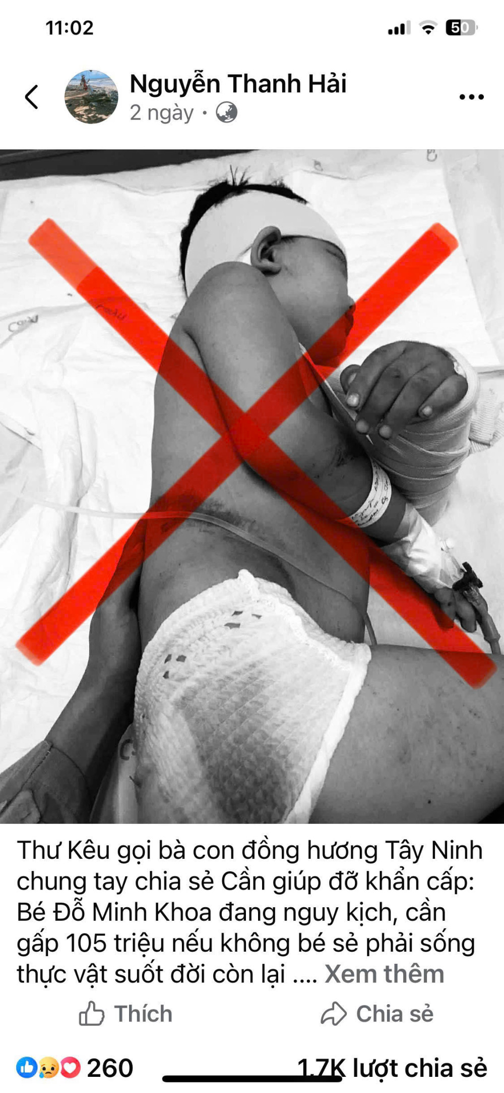 Theo đó, hiện nay, trên mạng xã hội Facebook xuất hiện bài viết kêu gọi quyên góp hỗ trợ cho trường hợp bé Đỗ Minh Khoa được cho là đang nguy kịch và điều trị tại Khoa Nhi – Bệnh viện Đa khoa Tây Ninh.