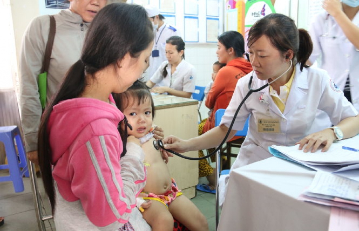 Bác sĩ Bệnh viện Nhi Đồng 1 (TP.HCM) khám cho bệnh nhi 2 tuổi bị bệnh viêm phổi - Ảnh: Tiến Long