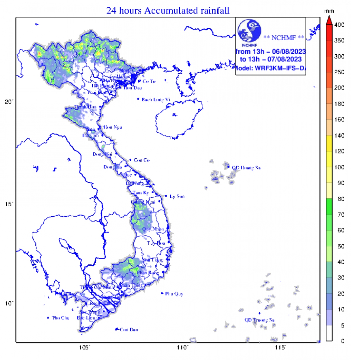 Theo Trung tâm Dự báo khí tượng thủy văn quốc gia, trong 24 giờ qua (từ 13h/05/8-13h/06/8) tại khu vực các tỉnh Lai Châu, Điện Biên, Sơn La, Yên Bái, Lào Cai, Cao Bằng, Hà Giang đã có mưa vừa, mưa to, có nơi mưa rất to. Cụ thể, tại Khoen On 345,2mm, TD Huội Quảng 271mm (Lai Châu), Chiềng Lao 2245,6mm (Sơn La), Mồ Dề 150,2mm (Yên Bái), Mường Tùng 136,3mm (Điện Biên...