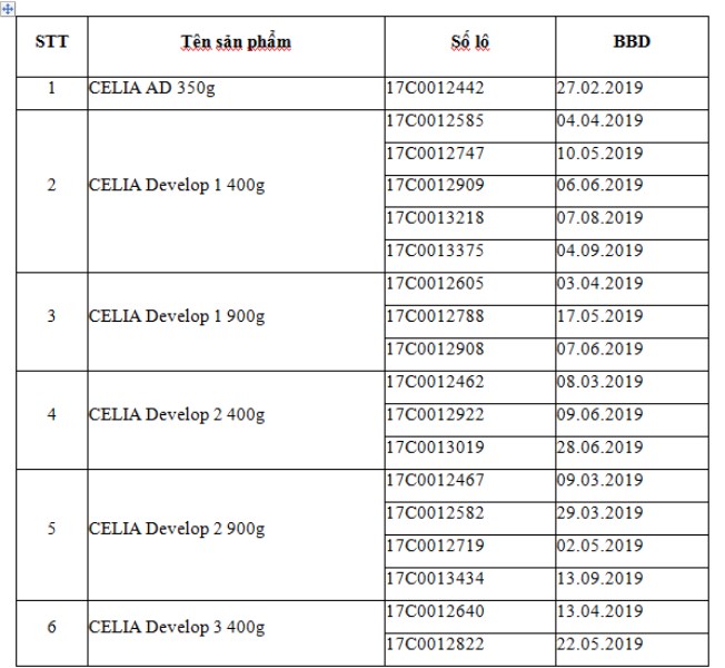 Danh sách các lô sữa nghi nhiễm khuẩn: