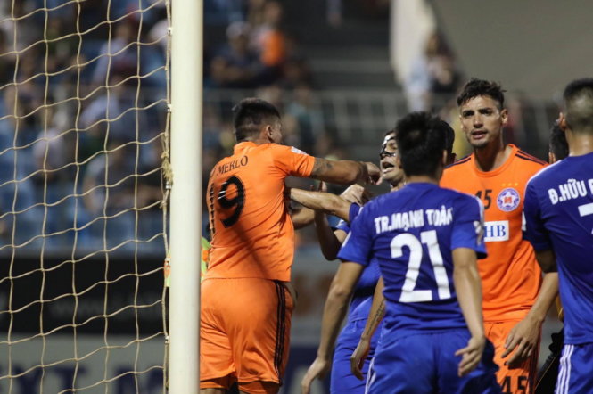 Tiền đạo Đỗ Merlo (19- SHB Đà Nẵng) dùng tay đẩy vào người Thiago (xanh- Quảng Nam). Ảnh: THẮNG LÊ
