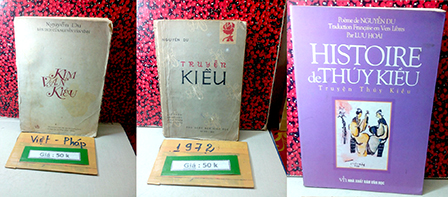Một số ấn bản Truyện Kiều (từ trái qua): song ngữ Việt - Pháp, bản dịch của học giả Nguyễn Văn Vĩnh; ấn bản của NXB Giáo Dục năm 1972; và "Histoire de Thúy Kiều" song ngữ Pháp Việt của dịch giả Lưu Hoài. Ảnh: DUY KHÔI