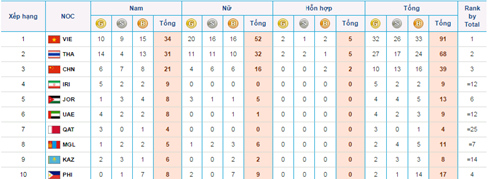 Trong buổi sáng ngày thi đấu chính thức thứ 6 tại đại hội, Đoàn TTVN tiếp tục dẫn đầu trên bảng tổng sắp huy chương, với 32 HCV, 26 HCB và 33 HCĐ. Đoàn Thái Lan xếp thứ 2 với 27 HCV, 17 HCB và 24 HCĐ./.