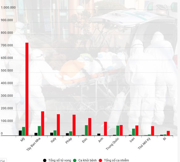 Mỹ vẫn là tâm dịch của thế giới với 879.430 ca nhiễm và 49.769 ca tử vong. Xếp sau Mỹ là Tây Ban Nha với 213.024 ca nhiễm và 22.157 ca tử vong, Italy với 189.973 ca nhiễm và 25.549 ca tử vong, Pháp với 158.183 ca nhiễm và 21.856 ca tử vong, Đức với 153.129 ca nhiễm và 5.575 ca tử vong.