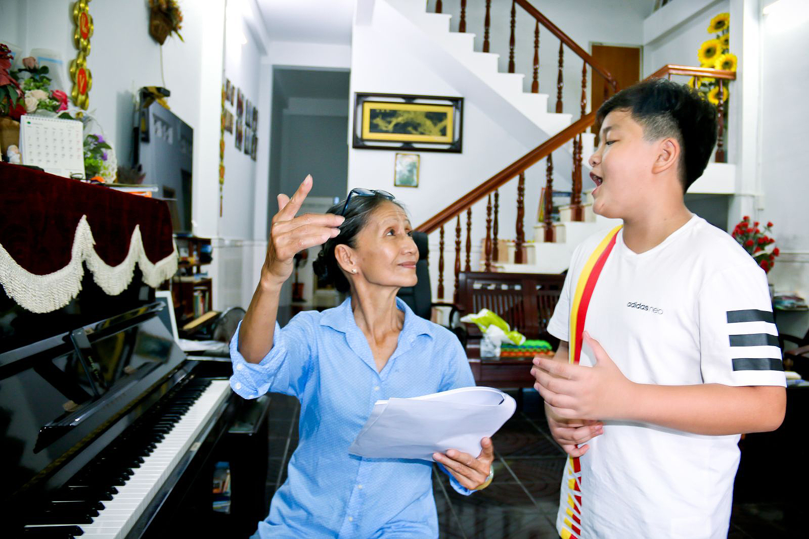 Chấn Quốc được ca sĩ Lệ Hằng tập luyện trước đêm chung kết “Giọng hát Việt nhí”.