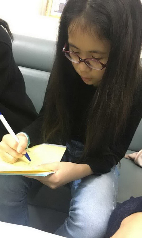 Cô gái bé nhỏ Mai An (11 tuổi) đang điền vào lá đơn xin hiến tạng tại Bệnh viện Việt Đức ngày 28/12.