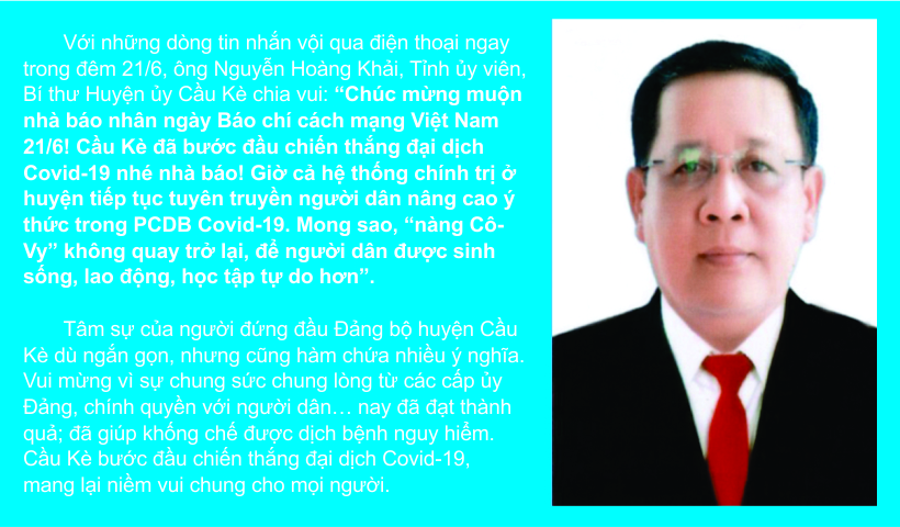 Trải qua hơn 20 ngày thực hiện các biện pháp cấp bách PCDB Covid-19 và thực hiện lệnh phong tỏa một đoạn của tuyến đường 30/4, thị trấn Cầu Kè, đêm 21/6 gần 200 người dân khu vực này vỡ òa niềm vui khi lệnh phong tỏa được dỡ bỏ. Quyết định số 1189/QĐ-UBND, ngày 21/6/2021 của UBND tỉnh về việc kết thúc thời gian thiết lập vùng cách ly y tế, giãn cách xã hội để PCDB Covid-19 được thực hiện giúp người dân nơi đây như được “cởi trói” trở lại cuộc sống bình thường mới.