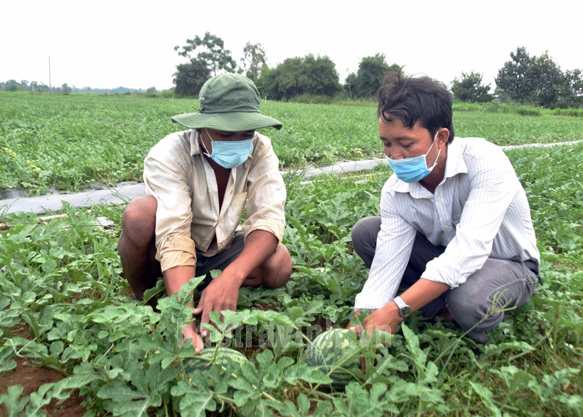 Ông Kim Sô Phan (phải), công chức nông nghiệp xã Long Sơn hướng dẫn kỹ thuật chăm sóc và phòng ngừa sâu bệnh khi dưa hấu đậu trái cho nông dân ấp Sóc Giụp.