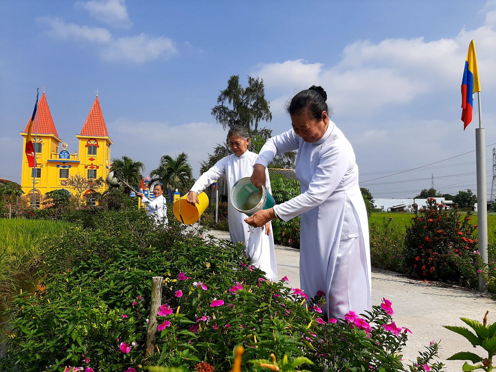 Tổ Phụ nữ tôn giáo như "cầu nối" tín đồ tôn giáo với tổ chức Hội và chính quyền địa phương (Trong ảnh: Thành viên Tổ phụ nữ tôn giáo xã Bình Quới chăm sóc tuyến đường hoa dẫn vào thánh thất)