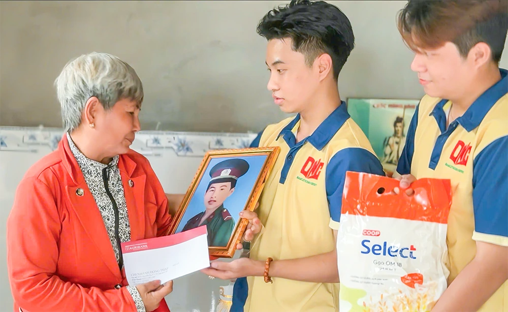 Cũng như bà Châu, 15 gia đình thân nhân liệt sĩ tại phường Mỹ Ngãi và xã Phú Thọ, tỉnh Đồng Tháp, được hỗ trợ phục dựng ảnh liệt sĩ. Đây là sáng kiến của sinh viên Nguyễn Quốc Khang, ngành Truyền thông đa phương tiện, Liên chi hội trưởng Liên chi hội sinh viên Đồng Tháp, Trường Đại học Nam Cần Thơ, triển khai thực hiện từ tháng 7-2025. Khang bộc bạch: “Trong các chuyến thăm gia đình chính sách, tôi thấy nhiều ảnh liệt sĩ được gia đình thờ phụng đã hư hỏng nặng theo thời gian. Vì vậy, tôi nghĩ đến việc ứng dụng công nghệ số để phục dựng ảnh liệt sĩ”.