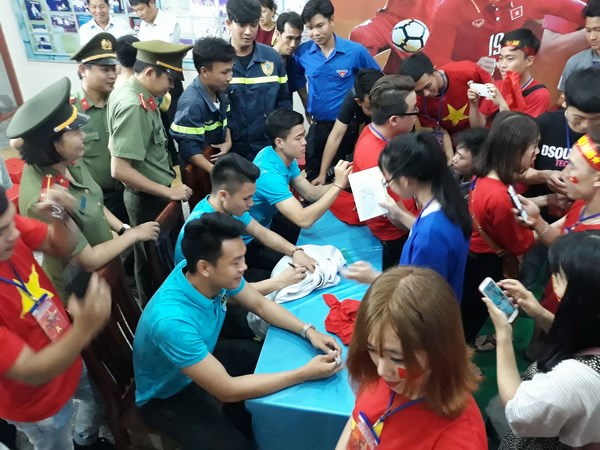 Các cầu thủ U23 Việt Nam ký tặng người hâm mộ tỉnh Ninh Thuận. (Ảnh: Nguyễn Thành/TTXVN)
