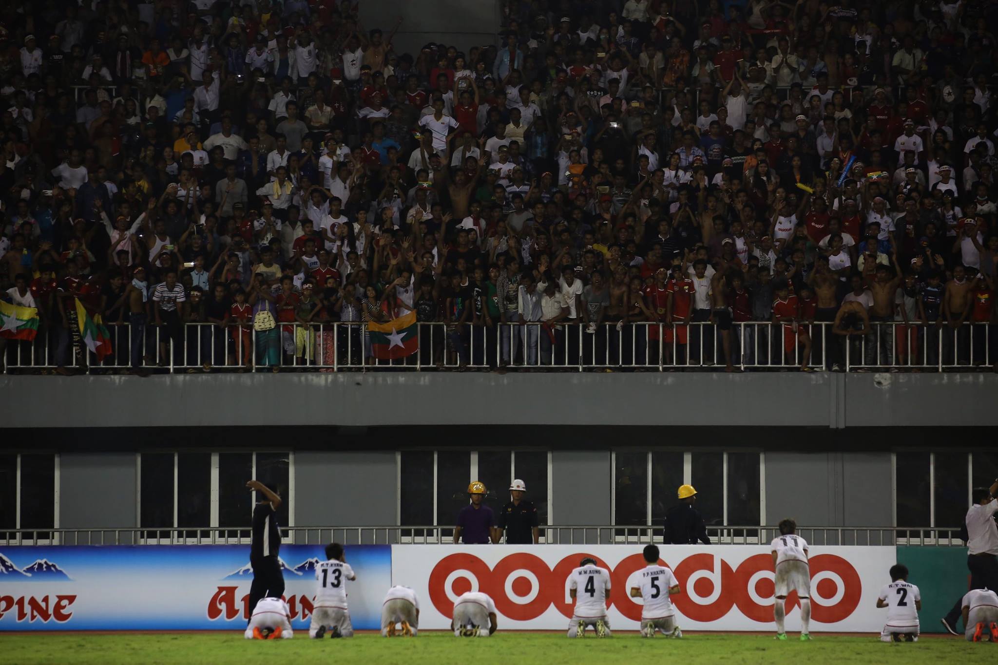 Các cầu thủ nữ Myanmar quỳ xuống sân để kêu gọi CĐV nhà đừng quậy nữa để hiệp phụ thứ nhất có thể bắt đầu. Ảnh: MFF.