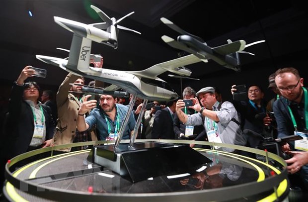 Mẫu taxi bay 4 chỗ mang tên Uber Air Taxi do hãng sản xuất ô tô Hyundai của Hàn Quốc hợp tác với Uber trình làng tại Triển lãm CES 2020 ở thành phố Las Vegas, Mỹ ngày 06/01/2020. Mẫu này có hình dáng kết hợp giữa trực thăng và máy bay cỡ nhỏ và chạy điện 100%. (Nguồn: Yonhap/TTXVN)