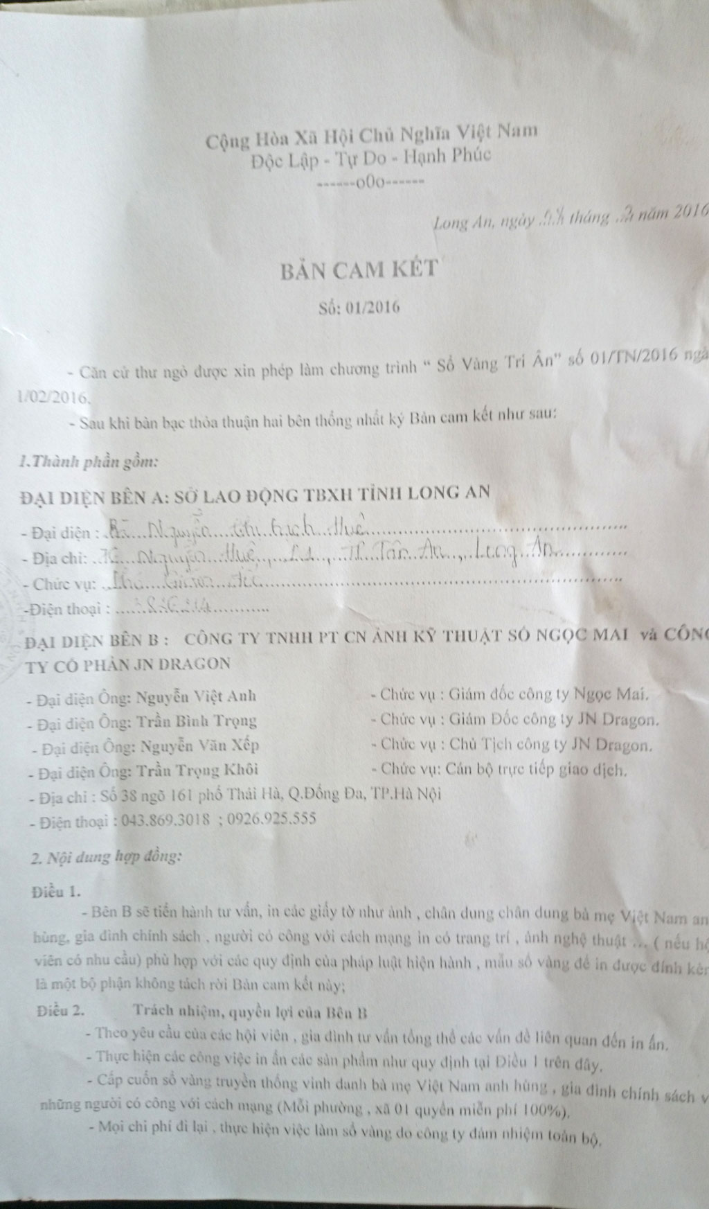 Theo ông Niên, trước đó vào ngày 1-2-2016, Sở LĐTB&XH có nhận được thư ngỏ của Cty TNHH phát triển Công nghệ ảnh kỹ thuật số Ngọc Mai về việc xin thực hiện chương trình “Sổ vàng tri ân” cho những người có công với cách mạng, những Bà Mẹ Việt Nam anh hùng, những anh hùng lực lượng vũ trang, anh hùng liệt sĩ, thương – bệnh binh. Theo đó Cty Ngọc Mai sẽ phối hợp với Cty Cổ phần JN Dragon cử người về thực hiện miễn phí 100% cho mỗi xã, phường trên toàn tỉnh Long An một quyển Album.