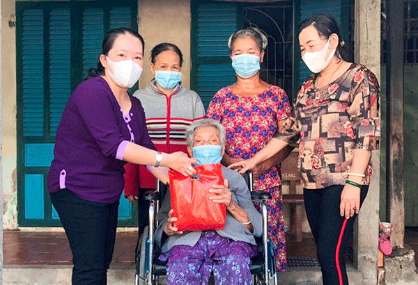 Chúng tôi cùng cán bộ Mặt trận và các đoàn thể phường đến thăm, tặng quà một số gia đình thuộc diện hộ nghèo, cận nghèo, hoàn cảnh đặc biệt khó khăn. Trong đó, có hộ bà Trần Thị Diềm ở khu vực Thạnh Mỹ. Bà Diềm 92 tuổi, sức khỏe yếu, phải ngồi xe lăn, đang sống cùng hai người con gái; trong đó, bà Phạm Thị Bé Năm đầu óc không được minh mẫn, nhưng rất thương và chăm sóc mẹ chu đáo, nhà cửa lúc nào cũng sạch sẽ. Nhà 3 người, chỉ có bà Phạm Thị Bé Sáu là lao động chính, với công việc rửa chén cho quán ăn. Cầm trên tay phần quà gồm 1 cái mền và nhu yếu phẩm trị giá hơn 300.000 đồng, bà Diềm xúc động nói: “Gia đình tôi được hỗ trợ thường xuyên gạo, mì gói và nhu yếu phẩm. Bữa nay, nhận được thêm cái mền, tôi thấy ấm áp vô cùng”.