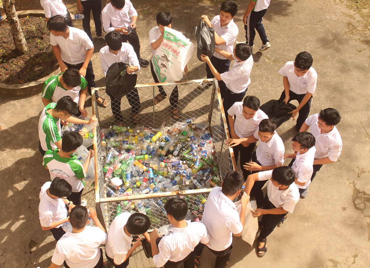 Học sinh Trường THPT Nguyễn Việt Dũng đóng góp chai, ly nhựa, bán để gây quỹ giúp đỡ các bạn có hoàn cảnh khó khăn.