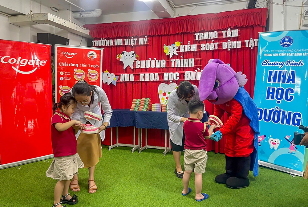 Nhân viên Khoa Sức khỏe môi trường - Y tế trường học, CDC TP Cần Thơ hướng dẫn trẻ đánh răng đúng cách. Ảnh: CTV