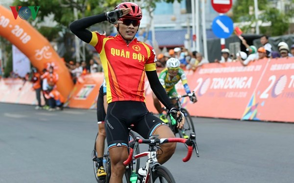 Tay đua Quách Tiến Dũng chào kiểu lính khi lần đầu tiên nhất chặng tại giải.