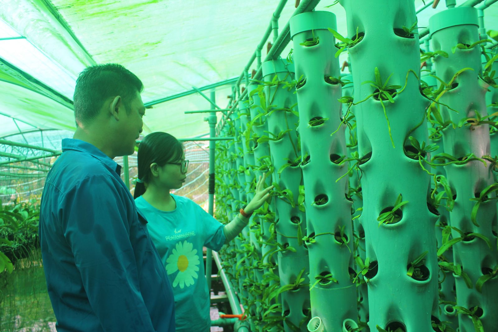Trồng lan theo mô hình khí canh trụ đứng giúp anh Hậu tiết kiệm được diện tích, hạn chế sâu, bệnh và tăng lợi nhuận
