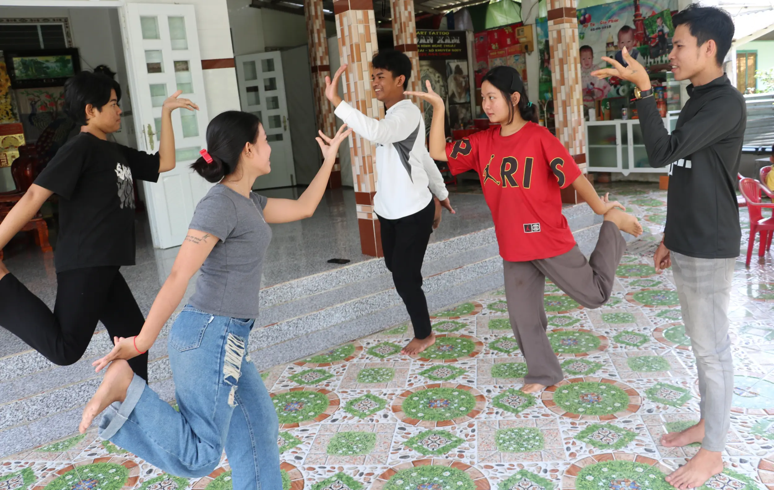 Nhiều bạn trẻ địa phương được anh Toàn (bìa phải) hướng dẫn các điệu múa truyền thống của đồng bào Khmer.
