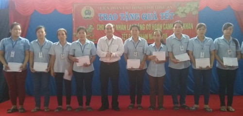 Lãnh đạo Liên đoàn Lao động tỉnh tặng quà cho công nhân có hoàn cảnh khó khăn nhân dịp Tết Nguyên đán Bính Thân 2016