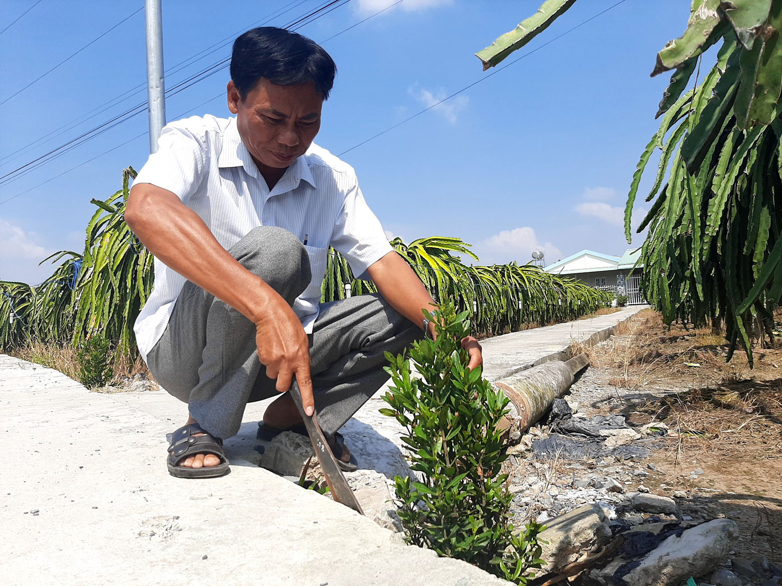Ông Nguyễn Văn Út giặm lại cụm hoa ven đường