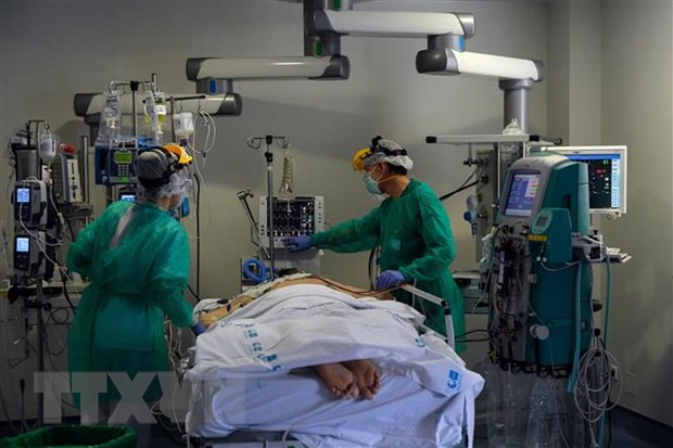 Nhân viên y tế chăm sóc bệnh nhân nhiễm COVID-19 tại bệnh viện ở Madrid, Tây Ban Nha, ngày 14/4/2020. (Ảnh: AFP/TTXVN)