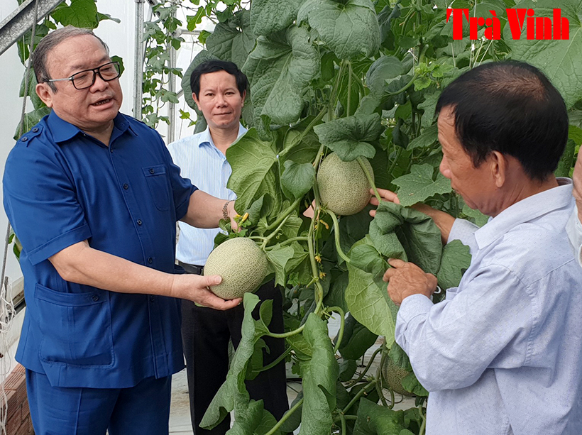 Tiến sĩ Thào Xuân Sùng (trái), Chủ tịch Trung ương Hội ND Việt Nam cùng đoàn công tác thăm mô hình trồng dưa lưới của Chi hội trồng màu công nghệ cao xã Lương Hòa A, huyện Châu Thành.