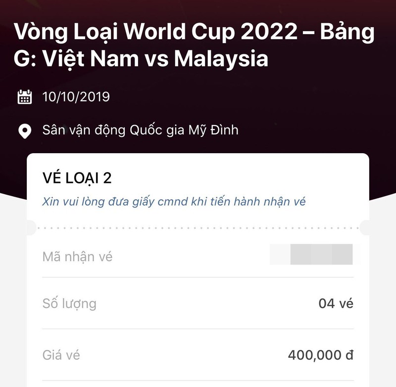 Ảnh chụp màn hình của 1 CĐV giao dịch mua vé thành công